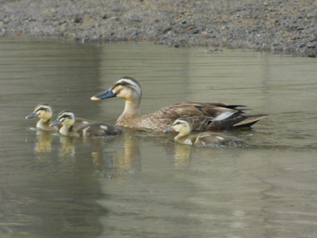 (今朝の3羽のヒナちゃんを連れたカルガモお母さん🦆)