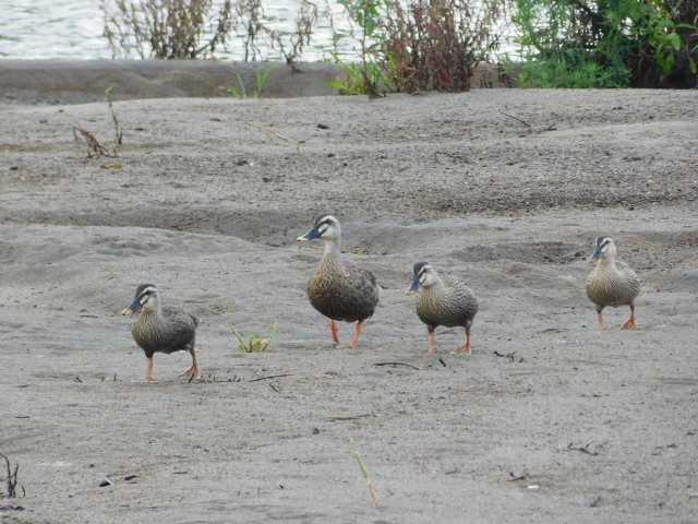 (今朝の3羽のヒナちゃんを連れたカルガモお母さん🦆)