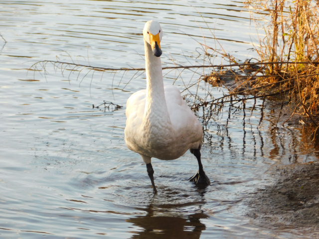 早速、ここで越冬中の飛来のオオハクチョウさんが向かって