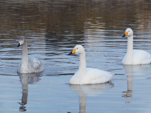 今朝1羽の幼鳥を連れたオオハクチョウさん一家がいたので