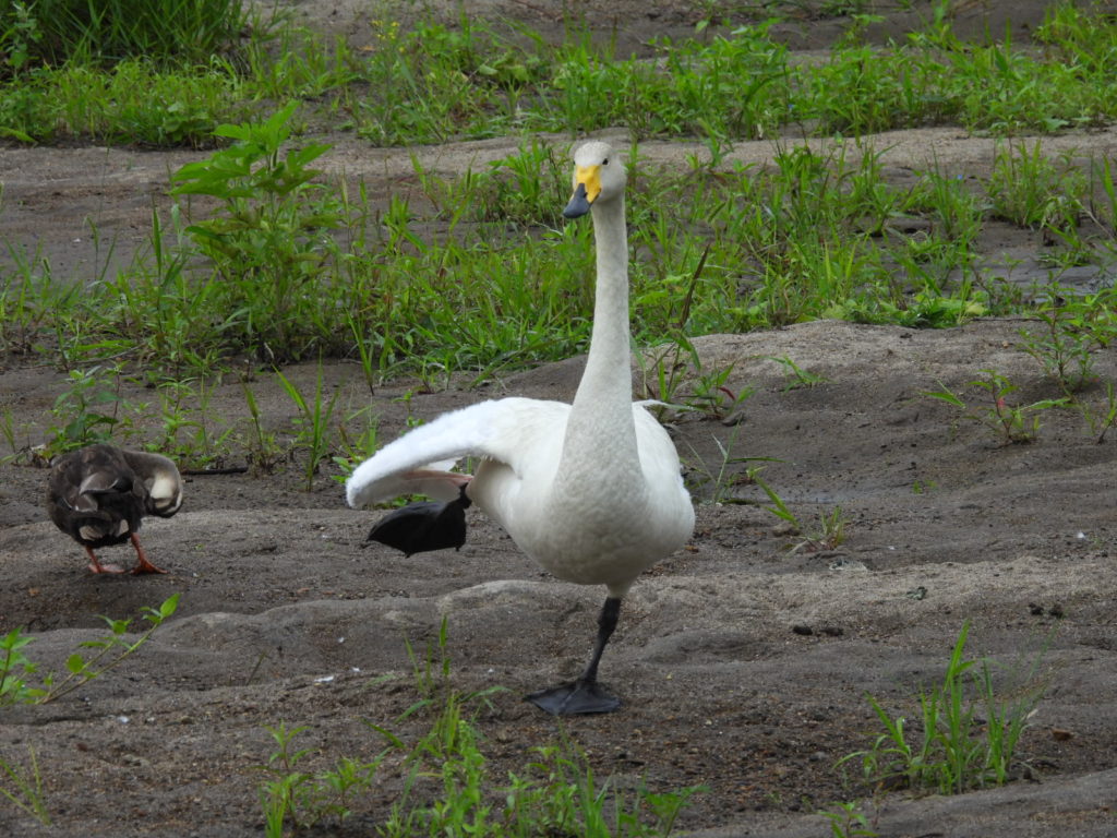 滞在組ハクチョウさんは7羽で大きな水たまりで待っていました。