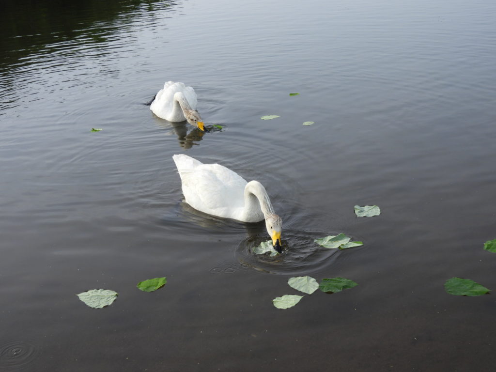 (葛の葉っぱを食べるノンちゃんとムーアちゃん🦢)