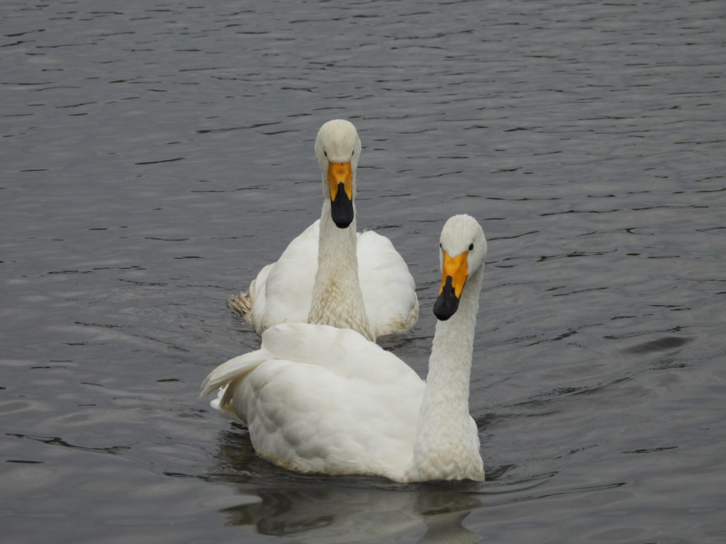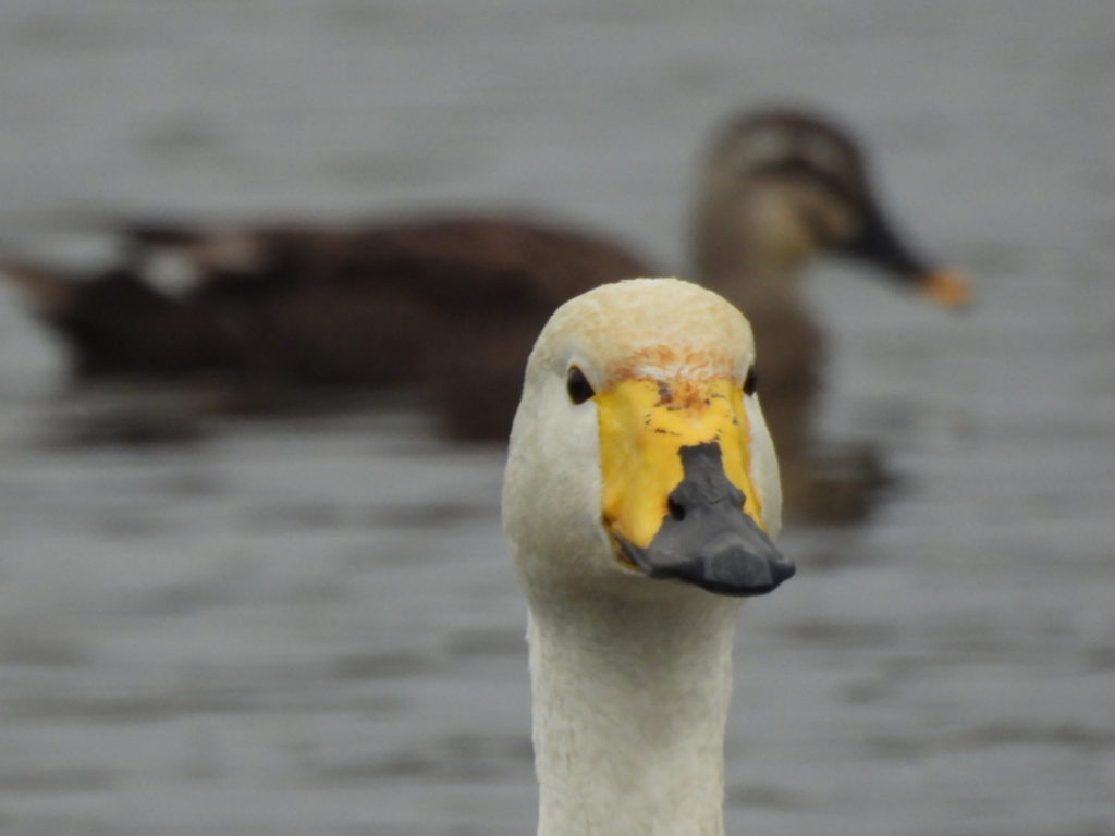 もう1羽のオオハクチョウさんは、クチバシの黄色が薄く、黒い模様が特徴的なので、
