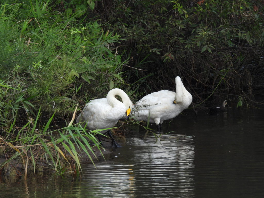 ノンちゃんとムーアちゃんが食べ終わって岸で羽繕いを始めると、