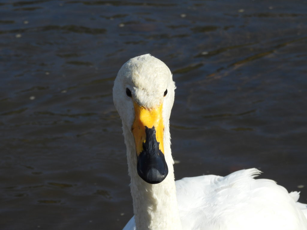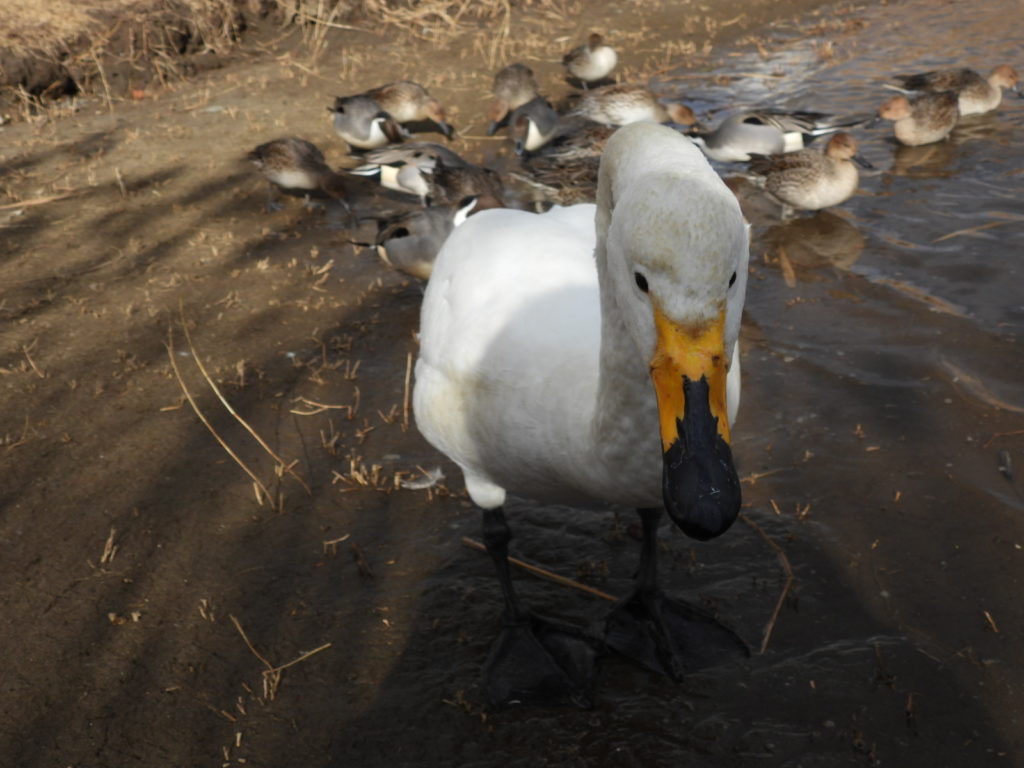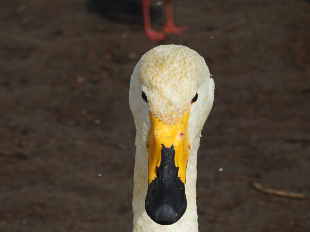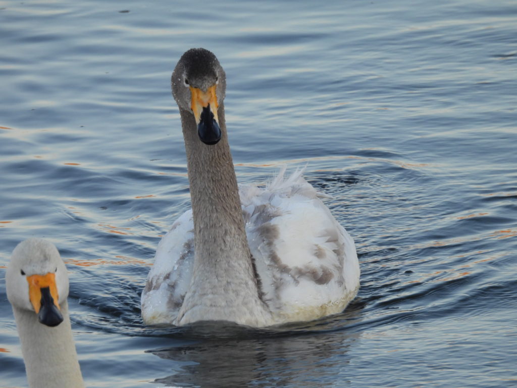 一方、頭が茶色のオオハクチョウさんもいます。