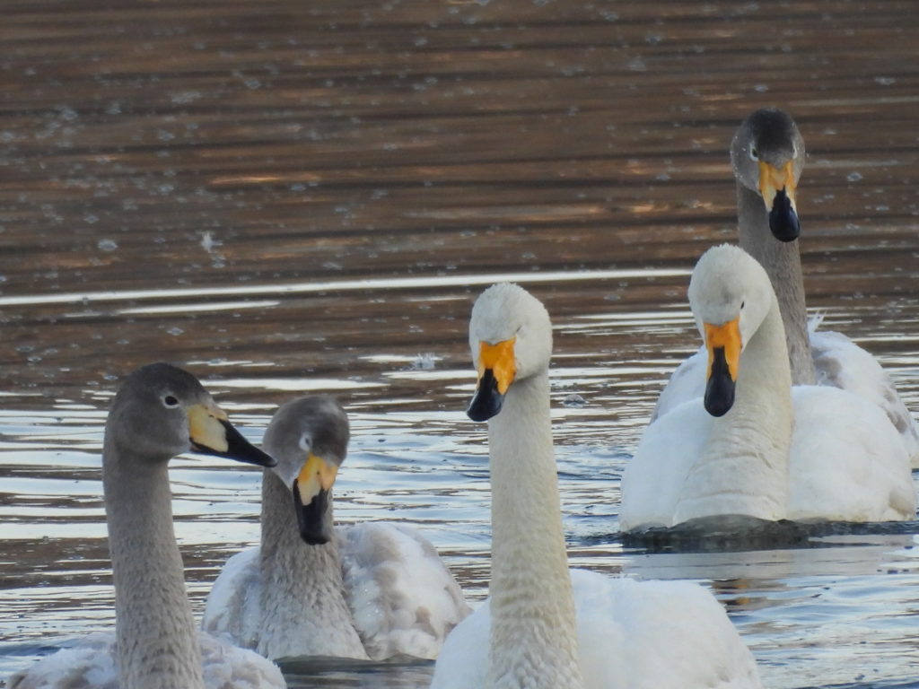 個体識別のためにも、これから、3羽の幼鳥を連れたオオハクチョウさん一家を